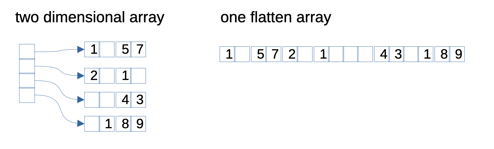 En fait, habituellement, on ne représente pas une matrice sous forme d'un tableau à double entrée, car cela veut dire effectuer deux indirections pour trouver la valeur, ce qui est lent. On alloue un tableau à une seule dimension de taille nodeCount * nodeCount et on se balade dedans en faisant des additions et des multiplications.